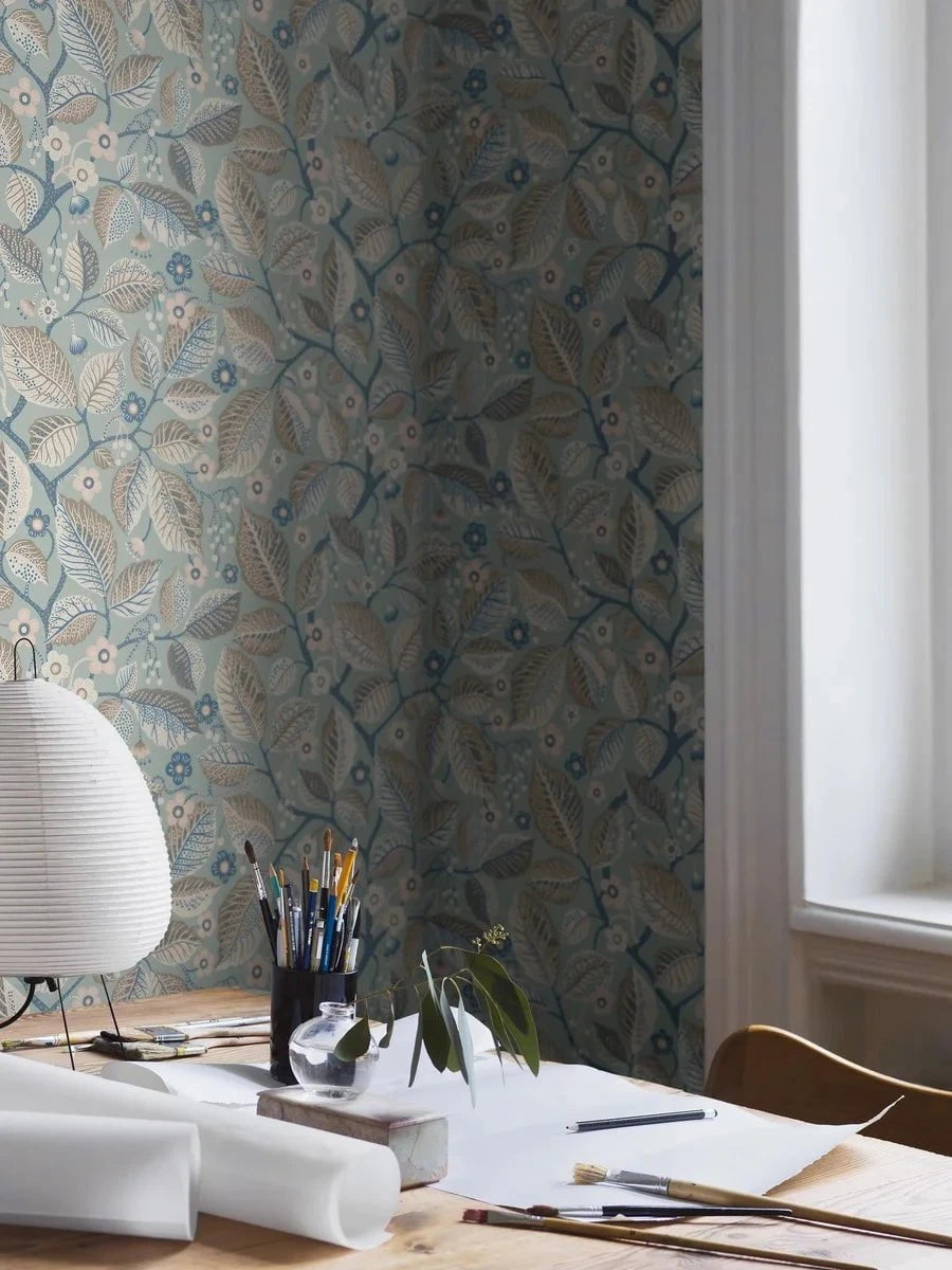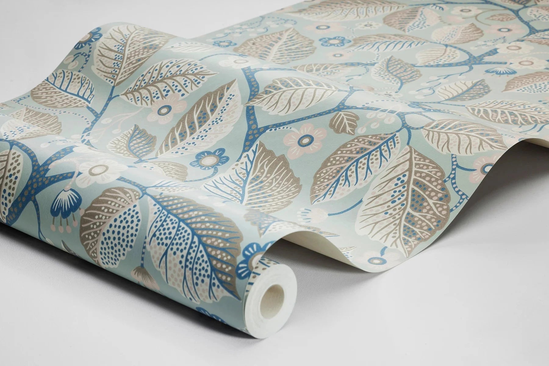 Brimming with Scandinavian charm, Elm Tree Blue by Boråstapeter brings artistic flair and natural beauty to any space. Set on a cool teal base, this imaginative wallpaper features a hand-painted mix of elm leaves, abstract florals, and geometric forms in soft shades of white, pink, blue, and light brown.
