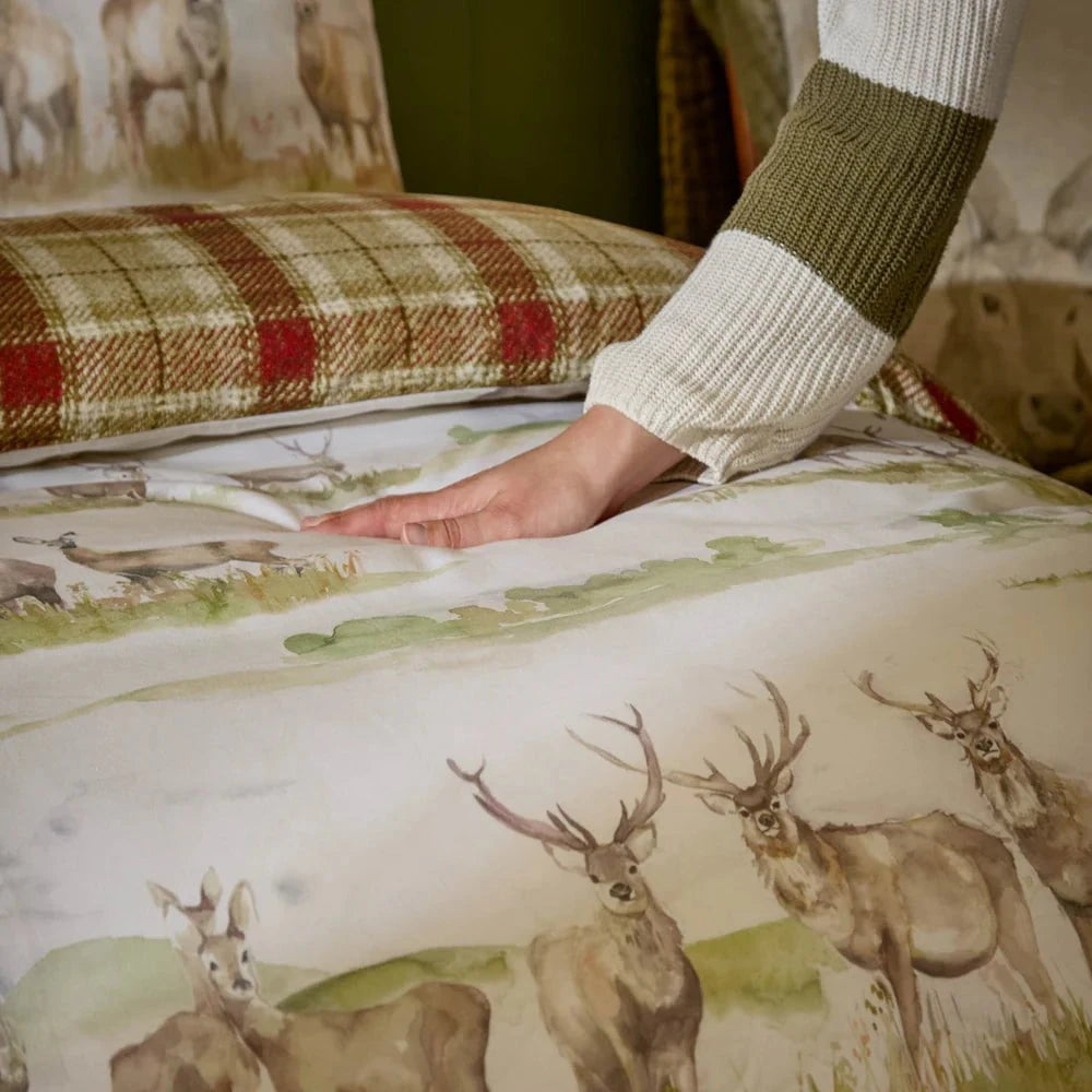 Bring a sense of country calm to your bedroom with the Moorland Stags Duvet Cover Set. Crafted from tumbled cotton, its breathability and softness invite you to sink in and truly unwind. The reversible design gives you two looks in one – choose wandering stags set against a tranquil backdrop for a nod to rural heritage, or flip to classic tartan when you fancy a more traditional touch. This set is made for homes where comfort is cherished, quality matters and every detail counts. Perfect for those seeking authentic British charm and lasting comfort in their sanctuary.